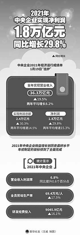 數(shù)據(jù)顯示,2021年,中央企業(yè)實(shí)現(xiàn)營(yíng)業(yè)收入36.3萬(wàn)億元,同比增長(zhǎng)19.5%;實(shí)現(xiàn)利潤(rùn)總額2.4萬(wàn)億元,同比增長(zhǎng)30.3%;實(shí)現(xiàn)凈利潤(rùn)1.8萬(wàn)億元,同比增長(zhǎng)29.8%,均創(chuàng)歷史最好水平。中央企業(yè)全員勞動(dòng)生產(chǎn)率人均達(dá)到69.4萬(wàn)元,同比增長(zhǎng)17.5%;百元營(yíng)業(yè)收入支付的成本費(fèi)用為94元,同比下降0.9元;年末資產(chǎn)負(fù)債率為64.9%,圓滿完成控制在65%以下的目標(biāo)。