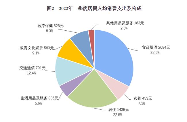 據(jù)悉,一季度,全國居民人均消費支出6393元,比上年名義增長6.9%,扣除價格因素影響,實際增長5.7%。分城鄉(xiāng)看,城鎮(zhèn)居民人均消費支出7924元,增長5.7%,扣除價格因素,實際增長4.4%;農村居民人均消費支出4388元,增長8.6%,扣除價格因素,實際增長7.8%。一季度,全國居民人均食品煙酒消費支出2084元,增長4.9%,占人均消費支出的比重為32.6%;人均衣著消費支出453元,增長3.6%,占人均消費支出的比重為7.1%;人均居住消費支出1435元,增長6.7%,占人均消費支出的比重為22.5%;人均生活用品及服務消費支出356元,增長4.8%,占人均消費支出的比重為5.6%;人均交通通信消費支出791元,增長12.7%,占人均消費支出的比重為12.4%;人均教育文化娛樂消費支出583元,增長6.9%,占人均消費支出的比重為9.1%;人均醫(yī)療保健消費支出528元,增長9.1%,占人均消費支出的比重為8.3%;人均其他用品及服務消費支出163元,增長17.1%,占人均消費支出的比重為2.5%。