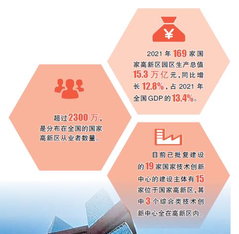 來自科技部火炬中心的數(shù)據(jù)顯示:2021年169家國家高新區(qū)園區(qū)生產(chǎn)總值15.3萬億元,同比增長(zhǎng)12.8%,占2021年全國GDP的13.4%。