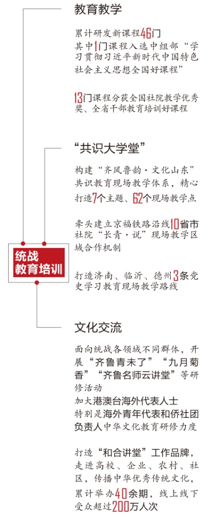 山東牢記“社院姓社”原則,以闡發(fā)習近平新時代中國特色社會主義思想為主線,創(chuàng)新構(gòu)建“初心與使命”“新山東”“大統(tǒng)戰(zhàn)”“齊魯文化傳承與創(chuàng)新”四大教學模塊和講清楚歷史、文化、理論、道路、制度、能力的“六個講清楚”課程體系,打造“一元多式、以文培元”山東特色共識教育教學樣板。累計研發(fā)新課程46門,其中1門課程入選中組部“學習貫徹習近平新時代中國特色社會主義思想全國好課程”;13門課程分獲全國社院教學優(yōu)秀獎、全省干部教育培訓好課程。積極推進教學科研資政一體化發(fā)展,成立政黨制度、儒商精神和宗教中國化3個研究中心,整合聚集資源推進科研攻關(guān),1項研究成果榮獲全國統(tǒng)戰(zhàn)理論政策研究創(chuàng)新成果一等獎。