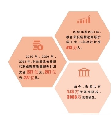 服務(wù)地方發(fā)展,還有實(shí)打?qū)嵉臄?shù)字支撐。2019年高職擴(kuò)招116.5萬人、2020年高職擴(kuò)招157.4萬人、2021年高職擴(kuò)招139.4萬人,他們中有退役軍人、下崗失業(yè)人員、農(nóng)民工。高職擴(kuò)招為社會(huì)培養(yǎng)高素質(zhì)技術(shù)技能人才的同時(shí),也有效緩解了嚴(yán)峻的就業(yè)形勢。