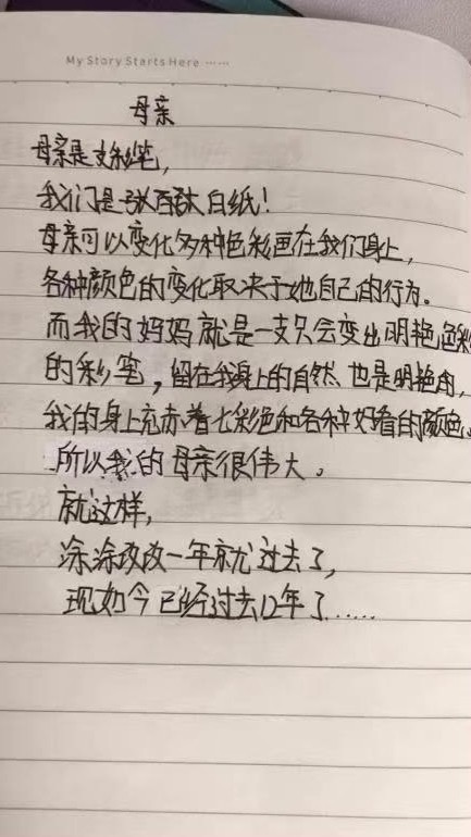 在與孩子們視頻通話時(shí),盛楠收到了一封來(lái)自大女兒親筆寫的信:“母親是支彩筆,我們是張白紙。母親可以變化多種色彩畫在我們身上,各種顏色的變化取決于她自己的行為。而我的媽媽就是一支只會(huì)變出明艷色彩的彩筆,留在我身上的自然也是明艷的,我的身上充斥著七彩色和各種好看的顏色,所以我的母親很偉大。就這樣,涂涂改改一年就過(guò)去了,現(xiàn)如今已經(jīng)過(guò)去12年了……”讀到這里盛楠濕潤(rùn)了眼眶。