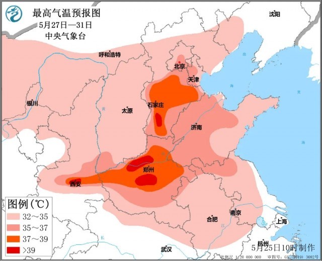5月27日至31日,西北地區(qū)東部、華北、黃淮、江淮等地將有一次高溫天氣過程,其中,京津冀地區(qū)、河南、山東中西部、蘇皖北部、陜西關(guān)中等地最高氣溫在35℃以上,河北南部、河南中西部、陜西關(guān)中等地超過37℃,局地可達(dá)39~40℃。