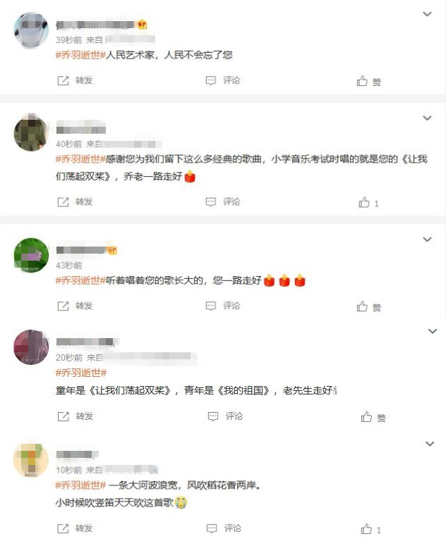 李谷一在聽聞喬羽逝世的消息后,第一時(shí)間發(fā)文悼念:“難忘我的喬老爺!我敬重、熱愛的合作伙伴!人世間雖再無他的身影,但他高尚愛國愛民的精神,樸實(shí)無華、善良可愛幽默的人品性格,無人能超越的偉大藝術(shù)才能和作品卻永遠(yuǎn)留存在人世間,留存在億萬人的心中!喬羽老爺子我永遠(yuǎn)想念您,一路走好!”