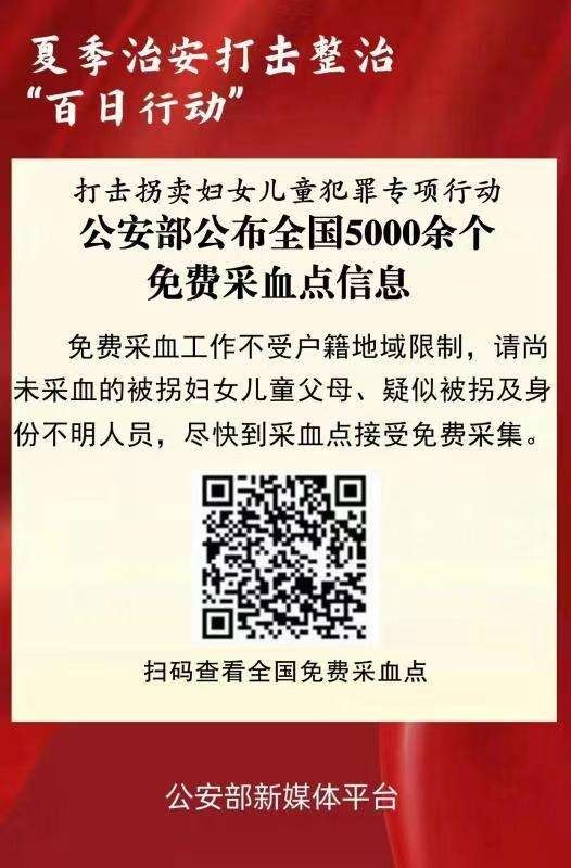 今年3月,公安部會同民政部、國家衛(wèi)健委、全國婦聯(lián)部署在全國組織開展新一輪打擊拐賣婦女兒童犯罪專項行動,“零容忍”打擊拐賣犯罪,在全社會形成強大震懾。為及時發(fā)現(xiàn)拐賣犯罪線索、最大程度便利有尋親需求人員就近采血,公安部在此前公布免費采血點基礎(chǔ)上,通過梳理匯總、集中資源,將免費采血點數(shù)量增至5000余個,并通過多種平臺集中發(fā)布相關(guān)信息,進一步擴大免費采血點覆蓋面,為縱深推進專項行動提供強有力的支撐。