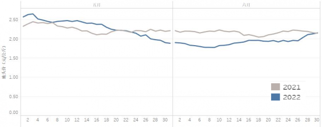 從價格走勢看(圖1),呈現(xiàn)三個特點:一是整體處于低價區(qū)間。6月是我國露地蔬菜生產(chǎn)旺季,全國平均氣溫、平均降水量較常年同期偏高,平均日照時數(shù)較2021年偏多,整體有利于蔬菜生產(chǎn),供應較為充足,月均地頭價環(huán)比、同比均呈下降態(tài)勢。二是月內(nèi)上旬呈下降趨勢。6月9日蔬菜地頭價1.78元/公斤,較月初1.90元/公斤下降了6.3%,跌至2022年以來的最低點,比年內(nèi)最高價(4.21元/公斤)下降57.7%。三是中下旬價格止跌回升。經(jīng)歷6月10—16日和26—30日兩輪較大幅度上漲,月末價格達到2.16元/公斤,比6月9日價格上升了21.3%。上漲主要原因:一方面,黃淮海及環(huán)渤海等地區(qū)因持續(xù)高溫天氣,設施蔬菜提前拉秧,供應量減少。另一方面,南方持續(xù)降雨影響蔬菜正常生長和采收,江西、湖南、廣西、福建等省部分地區(qū)發(fā)生不同程度洪澇災害,100多萬畝蔬菜受災。此外,受疫情影響的社會性消費開始復蘇,蔬菜需求量增加。