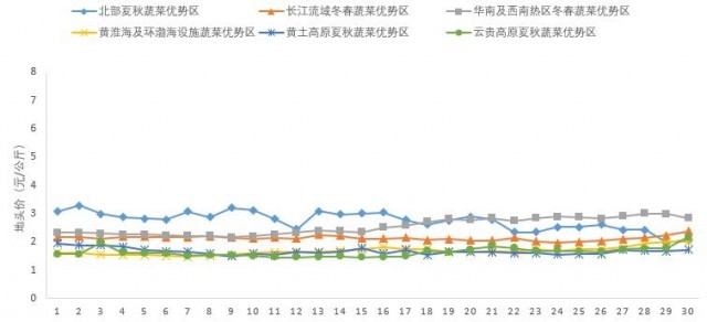 6月中后期地頭價從主產(chǎn)區(qū)看(圖2),除云貴高原夏秋蔬菜優(yōu)勢區(qū)月均地頭價環(huán)比持平外,其他優(yōu)勢區(qū)地頭價均有所下降,其中北部產(chǎn)區(qū)降幅相對較大。黃土高原夏秋蔬菜優(yōu)勢區(qū)、黃淮海及環(huán)渤海設施蔬菜優(yōu)勢區(qū)、北部夏秋蔬菜優(yōu)勢區(qū)、長江流域冬春蔬菜優(yōu)勢區(qū)、華南及西南熱區(qū)冬春蔬菜優(yōu)勢區(qū)6月月均地頭價環(huán)比分別下降了31.7%、19.3%、18.5%、17.8%、6.6%。