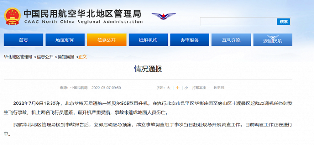 據(jù)民航局華北地區(qū)管理局網(wǎng)站7月7日消息,2022年7月6日15:30許,北京華彬天星通航一架貝爾505型直升機(jī),在執(zhí)行北京市昌平區(qū)華彬莊園至房山區(qū)十渡景區(qū)起降點(diǎn)調(diào)機(jī)任務(wù)時(shí)發(fā)生飛行事故,機(jī)上兩名飛行員遇難,直升機(jī)嚴(yán)重受損,事故未造成地面人員傷亡。