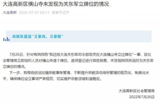 據(jù)大連高新微信公眾號(hào)消息, 7月26日,針對(duì)有網(wǎng)民稱“我還給大連關(guān)東軍司令部怨靈在大連橫山寺立過牌位”一事,區(qū)社會(huì)管理局立即組織人員對(duì)橫山寺逐個(gè)牌位、逐項(xiàng)登記進(jìn)行細(xì)致核查,未發(fā)現(xiàn)網(wǎng)民所說(shuō)的為關(guān)東軍立牌位的情況。