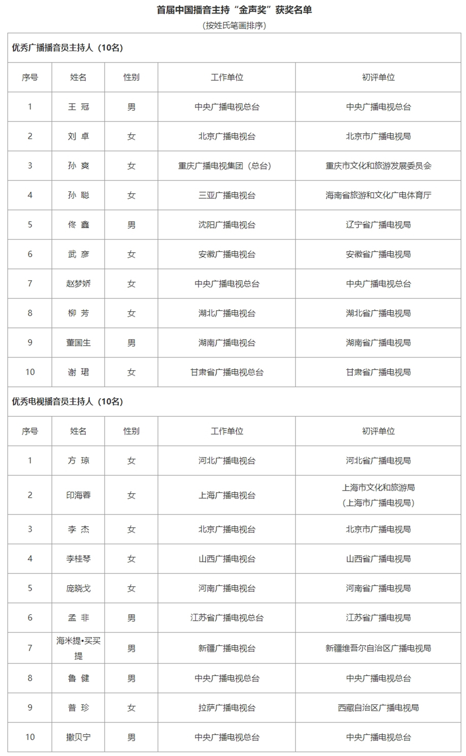 中新網(wǎng)8月8日電 據(jù)國家廣播電視總局網(wǎng)站消息,中國電視藝術(shù)委員會8日公布首屆中國播音主持“金聲獎”獲獎名單。共有10名優(yōu)秀廣播播音員主持人、10名優(yōu)秀電視播音員主持人獲獎,其中包括中央廣播電視總臺的撒貝寧,以及江蘇省廣播電視總臺的孟非等人。
