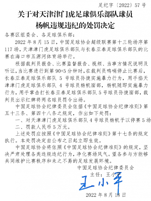 18日晚,中國足協(xié)網(wǎng)站發(fā)布4則球員、俱樂部官員違規(guī)違紀(jì)的處罰決定,中超天津津門虎球員楊帆、中超長春亞泰球員孫捷及中乙青島紅獅球員王建文均停賽5場,中甲遼寧沈陽城市足球俱樂部官員林濤6場比賽禁止進入體育場。處罰決定全文如下: