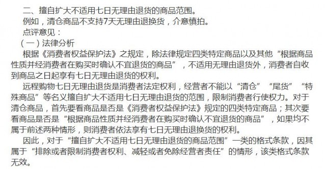 因此,對于“擅自擴(kuò)大不適用七日無理由退貨的商品范圍”一類的格式條款,因其屬于“排除或者限制消費(fèi)者權(quán)利、減輕或者免除經(jīng)營者責(zé)任”的情形,該類格式條款無效。(中新財(cái)經(jīng))