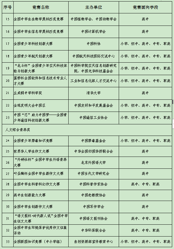 根據(jù)《教育部辦公廳等四部門關(guān)于印發(fā)<面向中小學(xué)生的全國性競賽活動管理辦法>的通知》精神,由主辦單位自主申報,經(jīng)組織專家進(jìn)行嚴(yán)格評審把關(guān),擬確定全國青少年人工智能創(chuàng)新挑戰(zhàn)賽等45項(xiàng)競賽為2022-2025學(xué)年面向中小學(xué)生開展的全國性競賽活動,舉辦時間原則上為2022年9月至2025年8月,在此期間每學(xué)年舉辦不得超過1次,累計(jì)不超過3次?,F(xiàn)就相關(guān)信息予以公示,公示期為2022年8月23日至29日。