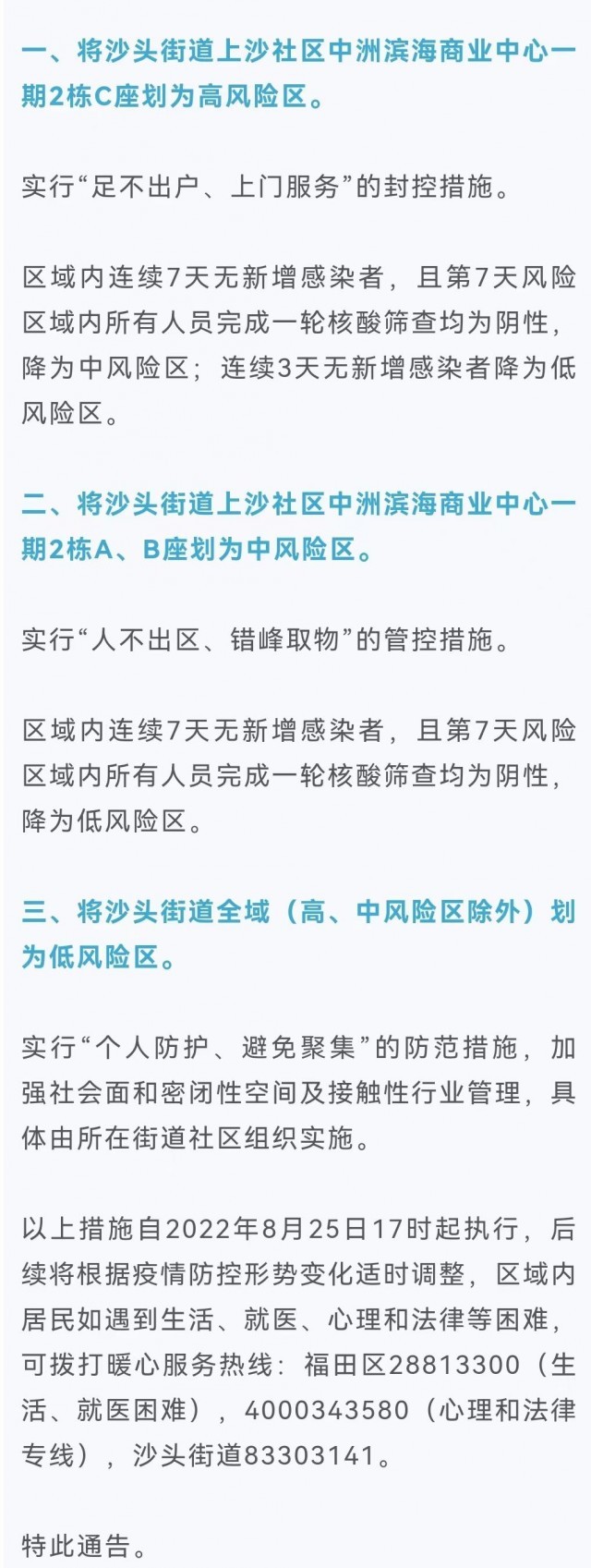 8月25日,廣東省深圳市福田區(qū)新型冠狀病毒肺炎疫情防控指揮部發(fā)布通告稱,根據當前福田區(qū)疫情防控工作需要,按照國務院應對新型冠狀病毒肺炎疫情聯(lián)防聯(lián)控機制綜合組《新型冠狀病毒肺炎疫情防控方案(第九版)》和《廣東省新冠肺炎本地疫情應急處置方案(第五版)》相關規(guī)定,經專家組研判,自2022年8月25日起,福田區(qū)在沙頭街道劃定高風險區(qū)、中風險區(qū)、低風險區(qū)如下: