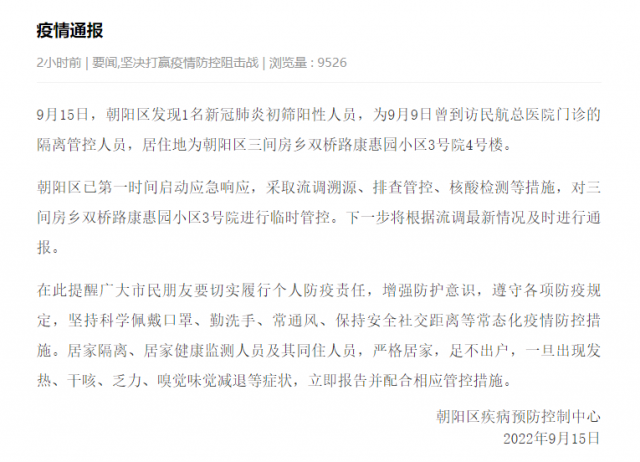 9月15日,北京朝陽區(qū)發(fā)現1名新冠肺炎初篩陽性人員,為9月9日曾到訪民航總醫(yī)院門診的隔離管控人員,居住地為朝陽區(qū)三間房鄉(xiāng)雙橋路康惠園小區(qū)3號院4號樓。