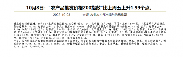 央視網(wǎng)消息:據(jù)農(nóng)業(yè)農(nóng)村部網(wǎng)站,10月8日"農(nóng)產(chǎn)品批發(fā)價(jià)格200指數(shù)"為127.54,比節(jié)前(9月30日,下同)上升1.99個(gè)點(diǎn),“菜籃子”產(chǎn)品批發(fā)價(jià)格指數(shù)為129.35,比節(jié)前上升2.32個(gè)點(diǎn)。截至今日14:00時(shí),全國(guó)農(nóng)產(chǎn)品批發(fā)市場(chǎng)豬肉平均價(jià)格為32.81元/公斤,比節(jié)前上升2.5%。