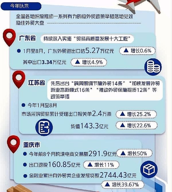 跨境電商等新業(yè)態(tài)也成為穩(wěn)外貿(mào)的重要力量。今年,重慶成功舉辦了跨境電商交易會,積極推動跨境電商“保稅進口+零售分裝”業(yè)務試點,推廣“跨境電商+產(chǎn)業(yè)帶”模式,為外貿(mào)企業(yè)穩(wěn)訂單、拓市場提供了新的解決方案。今年前8個月,重慶跨境電商交易額達291.9億元,增長50%。