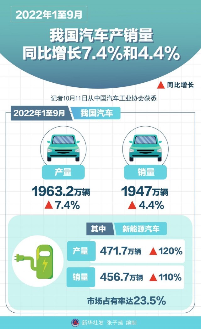 新華社北京10月11日電(記者高亢、戴小河)記者11日從中國汽車工業(yè)協(xié)會(huì)獲悉,今年1至9月,我國汽車產(chǎn)銷量分別達(dá)1963.2萬輛和1947萬輛,同比增長7.4%和4.4%。其中,新能源汽車產(chǎn)銷量分別達(dá)471.7萬輛和456.7萬輛,同比增長120%和110%,市場(chǎng)占有率達(dá)23.5%。