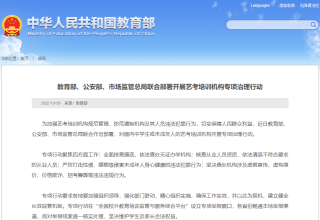 據(jù)教育部網(wǎng)站消息,為加強(qiáng)藝考培訓(xùn)機(jī)構(gòu)規(guī)范管理,防范遏制機(jī)構(gòu)及其人員違法犯罪行為,切實(shí)保障人民群眾利益,近日教育部、公安部、市場(chǎng)監(jiān)管總局聯(lián)合作出部署,對(duì)面向中學(xué)生或未成年人的藝考培訓(xùn)機(jī)構(gòu)開(kāi)展專(zhuān)項(xiàng)治理行動(dòng)。