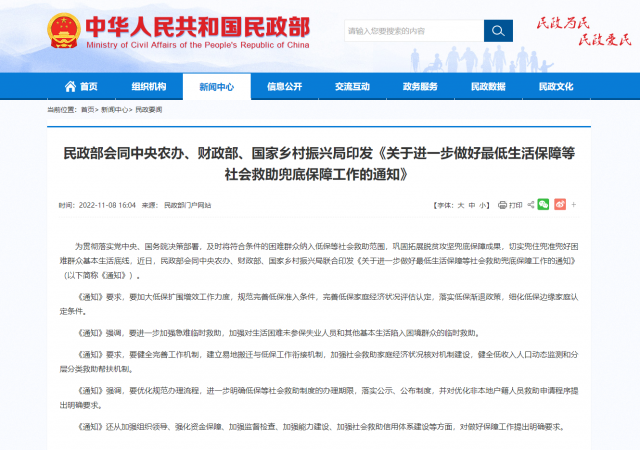 據(jù)民政部網(wǎng)站消息,為貫徹落實黨中央、國務院決策部署,及時將符合條件的困難群眾納入低保等社會救助范圍,鞏固拓展脫貧攻堅兜底保障成果,切實兜住兜準兜好困難群眾基本生活底線,近日,民政部會同中央農(nóng)辦、財政部、國家鄉(xiāng)村振興局聯(lián)合印發(fā)《關于進一步做好最低生活保障等社會救助兜底保障工作的通知》(以下簡稱《通知》)。