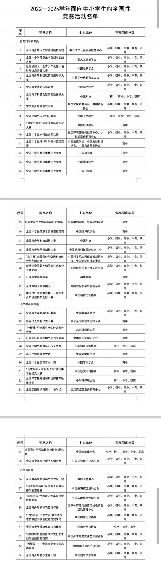 教育部公布44項中小學(xué)生全國性競賽活動名單