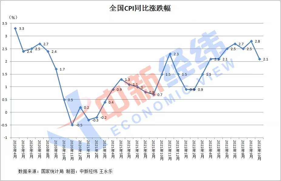 國家統(tǒng)計局數(shù)據(jù)顯示,2022年10月,全國CPI環(huán)比上漲0.1%,同比上漲2.1%。同比漲幅較9月明顯回落,且連續(xù)第4個月低于市場預期。