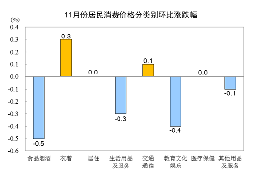 11月份,全國居民消費(fèi)價(jià)格環(huán)比下降0.2%。其中,城市下降0.2%,農(nóng)村下降0.2%;食品價(jià)格下降0.8%,非食品價(jià)格持平;消費(fèi)品價(jià)格下降0.1%,服務(wù)價(jià)格下降0.2%。