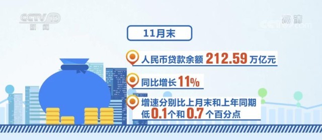 11月末,人民幣貸款余額212.59萬億元,同比增長11%,增速分別比上月末和上年同期低0.1個和0.7個百分點。11月份人民幣貸款增加1.21萬億元,同比少增596億元。
