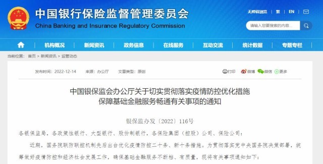 央視網(wǎng)消息:12月13日,中國銀保監(jiān)會辦公廳發(fā)文《關于切實貫徹落實疫情防控優(yōu)化措施 保障基礎金融服務暢通有關事項的通知》。