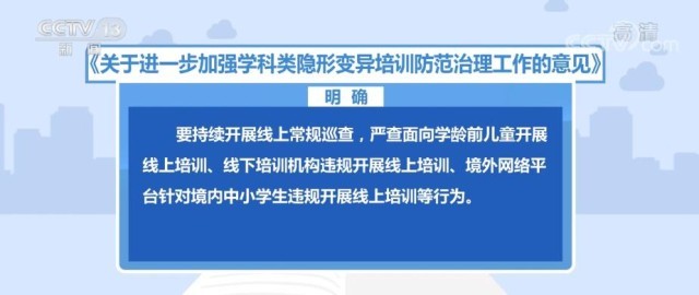 《意見》明確,要持續(xù)開展線上常規(guī)巡查,嚴(yán)查面向?qū)W齡前兒童開展線上培訓(xùn)、線下培訓(xùn)機構(gòu)違規(guī)開展線上培訓(xùn)、境外網(wǎng)絡(luò)平臺針對境內(nèi)中小學(xué)生違規(guī)開展線上培訓(xùn)等行為。