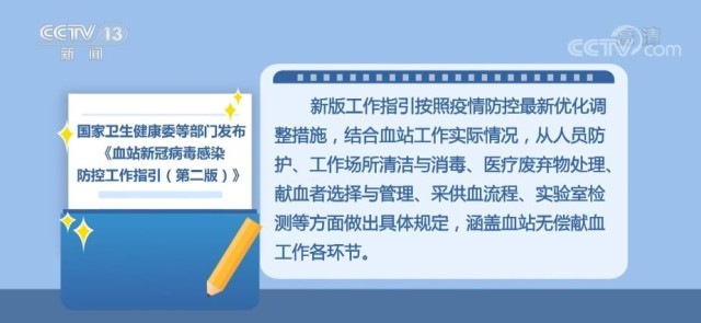 央視網(wǎng)消息:為落實(shí)進(jìn)一步優(yōu)化新冠肺炎疫情防控措施相關(guān)要求,指導(dǎo)采供血機(jī)構(gòu)科學(xué)有效做好無(wú)償獻(xiàn)血工作,國(guó)家衛(wèi)生健康委辦公廳、中央軍委后勤保障部衛(wèi)生局組織專家對(duì)2021年印發(fā)的《血站新冠肺炎疫情常態(tài)化防控工作指引》進(jìn)行修訂,形成《血站新冠病毒感染防控工作指引(第二版)》,指導(dǎo)采供血機(jī)構(gòu)切實(shí)做好新形勢(shì)下疫情防控工作,保障血站工作人員和獻(xiàn)血者安全,實(shí)現(xiàn)血液安全供應(yīng)。