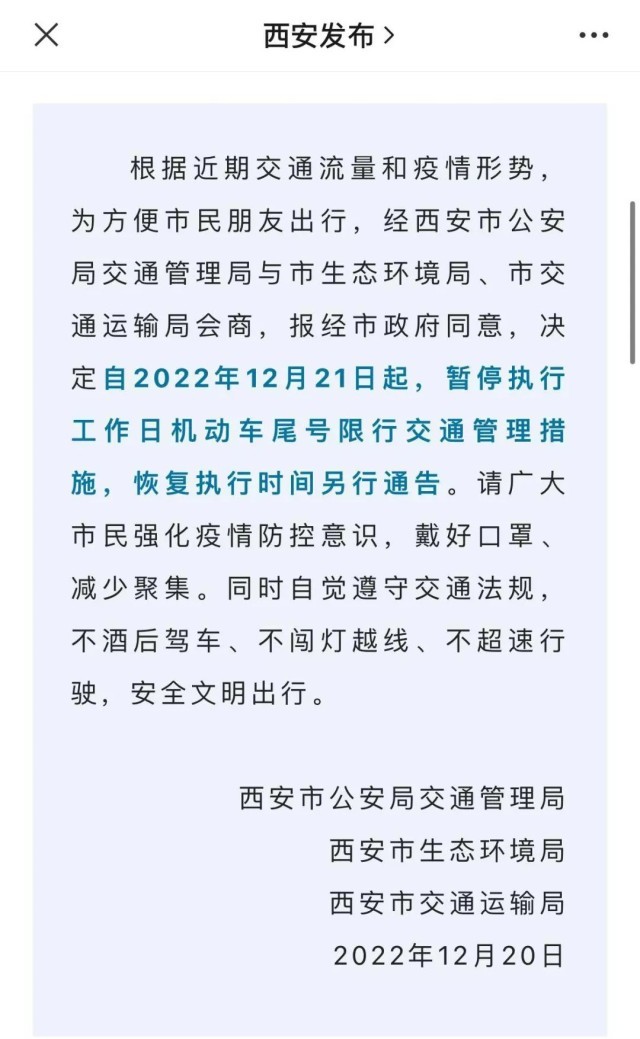 12月20日,陜西西安多部門發(fā)布通知,根據(jù)近期交通流量和疫情形勢,為方便市民朋友出行,決定自2022年12月21日起,暫停執(zhí)行工作日機動車尾號限行交通管理措施,恢復執(zhí)行時間另行通告。
