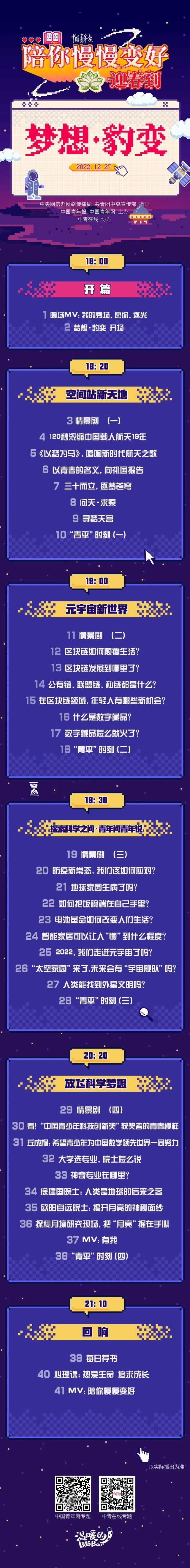 在這場聯(lián)播節(jié)目中,4位年輕記者將通過自己的經(jīng)歷和故事,和大家一起回顧2022年與科技創(chuàng)新有關(guān)的瞬間,重溫那些帶給我們“夢想”和“豹變”的激情時刻。聯(lián)播由空間站新天地、元宇宙新世界、探索科學(xué)之問、放飛科學(xué)夢想等四大篇章組成,重磅環(huán)節(jié)“探索科學(xué)之問”將聯(lián)合北京市科協(xié),共同推出聯(lián)名款“青年問青年說”,青年科學(xué)家和大學(xué)生一起盤點這些熱點科技問題:防疫新常態(tài),我們該如何應(yīng)對?極端天氣頻發(fā),地球家園生病了?2022年,我們走進(jìn)元宇宙了嗎?“太空家園”來了,未來會不會有“宇宙艦隊”…… 12月27日,我們不見不散。