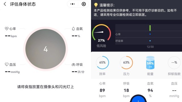 沙憲政分析稱,網(wǎng)上類似小程序和手機App是經由手機攝像頭攝像,通過測量人體手指尖或面部動脈血管隨心臟搏動引起充盈的波動和顏色的變化(也就是光譜分析),來檢測心率和血氧飽和度等指標的。