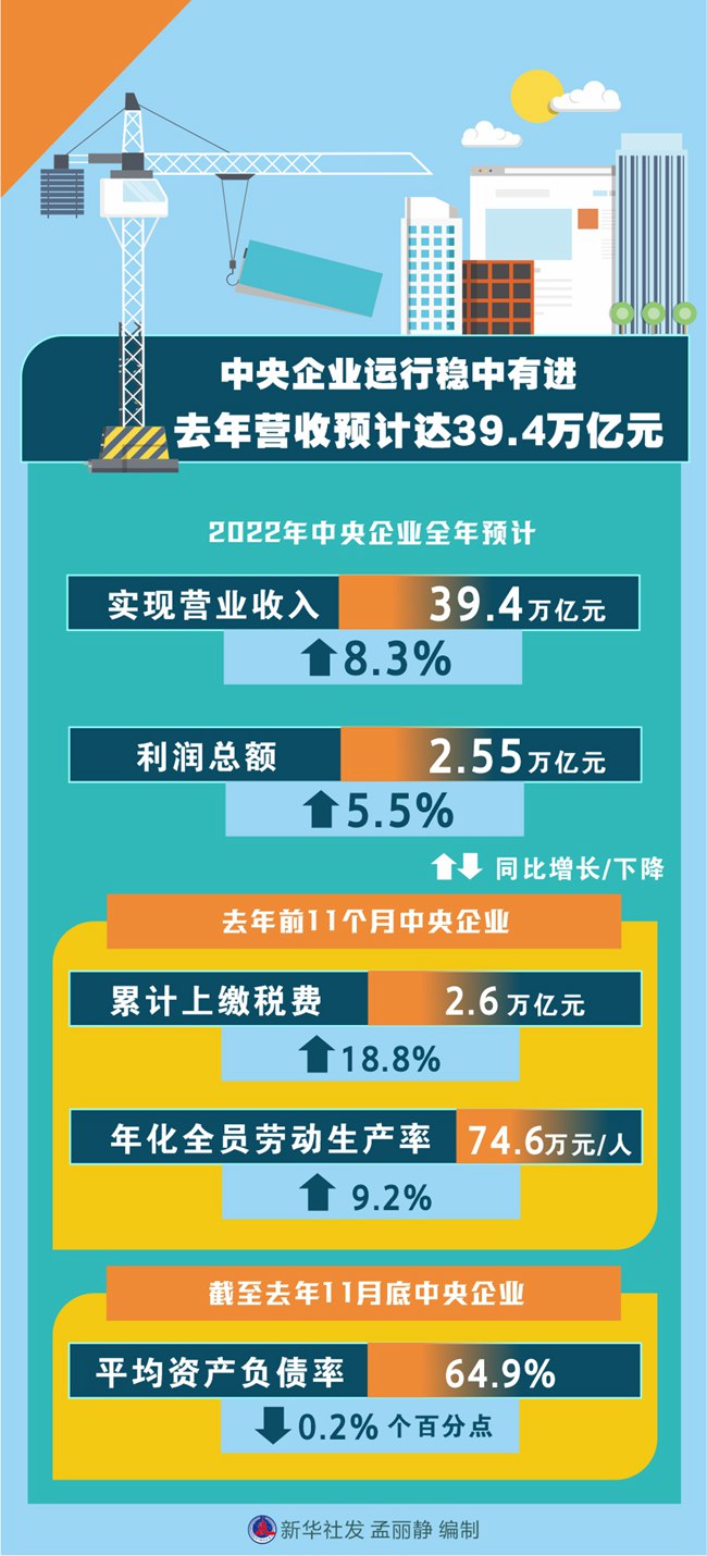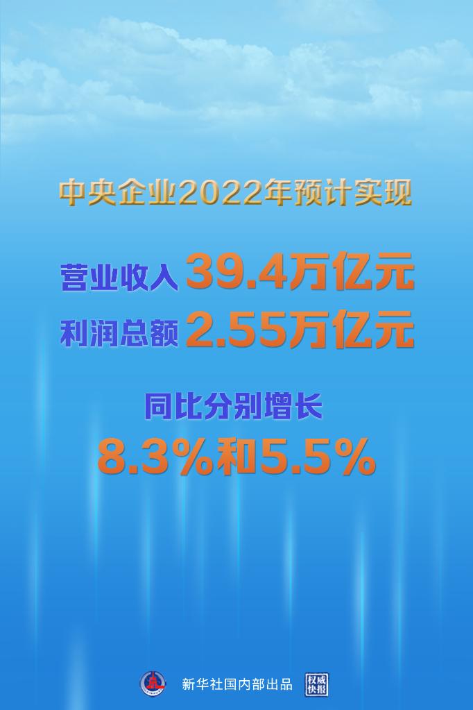 新華社北京1月5日電(記者王希)2022年,國資央企統(tǒng)籌疫情防控和企業(yè)生產(chǎn)經(jīng)營,統(tǒng)籌發(fā)展和安全,推動經(jīng)濟運行實現(xiàn)穩(wěn)中有進,中央企業(yè)全年預計實現(xiàn)營業(yè)收入39.4萬億元、利潤總額2.55萬億元,同比分別增長8.3%和5.5%。