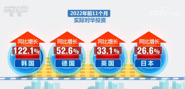 2022年前9個(gè)月,中國吸收外資規(guī)模就達(dá)到1萬億元;前11個(gè)月,突破1.15萬億元,超過2021年全年水平;與此同時(shí),外資來源更加多元。2022年前11個(gè)月,韓國、德國、英國、日本等國家的實(shí)際對華投資同比分別增長122.1%、52.6%、33.1%和26.6%。