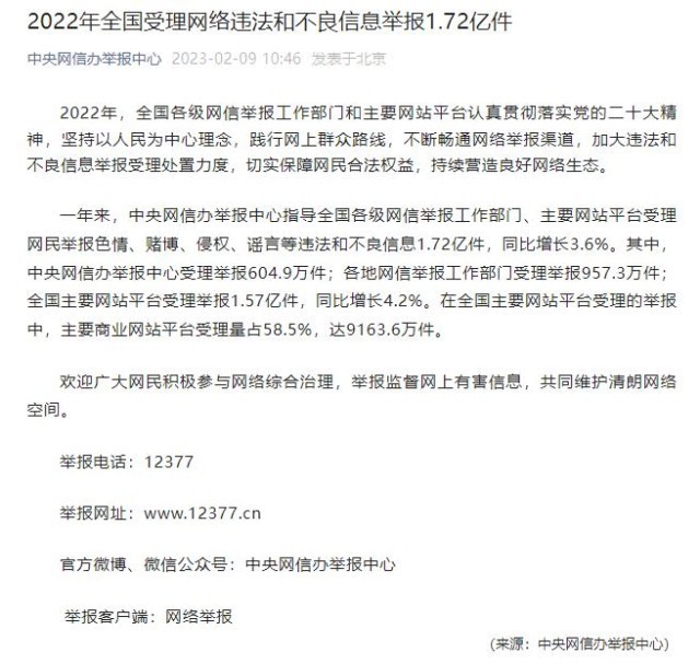 2022年全國(guó)受理網(wǎng)絡(luò)違法和不良信息舉報(bào)1.72億件