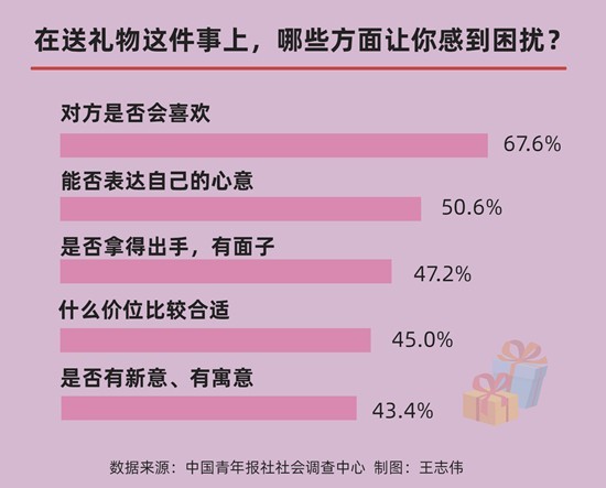 中國(guó)青年報(bào)社社會(huì)調(diào)查中心的調(diào)查顯示,在送禮物上,69.9%的受訪青年感到有困擾,且男生有困擾的比例高于女生,這也從一定程度上反映出男生在禮物選擇和情感表達(dá)上更為糾結(jié)。