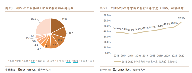 據(jù)德邦證券研報(bào),嬰配粉市場中飛鶴、伊利、雀巢占據(jù)前三,行業(yè)集中度加速提升。根據(jù)Euromonitor的數(shù)據(jù),2022年銷售額前五的品牌為飛鶴、伊利、雀巢、達(dá)能與君樂寶,市場份額分別為17.5%、12.3%、10.7%、10.3%及6.4%,貝因美的市占率為1.7%,排名第十。前十名中,國產(chǎn)品牌和國外品牌各占5席。