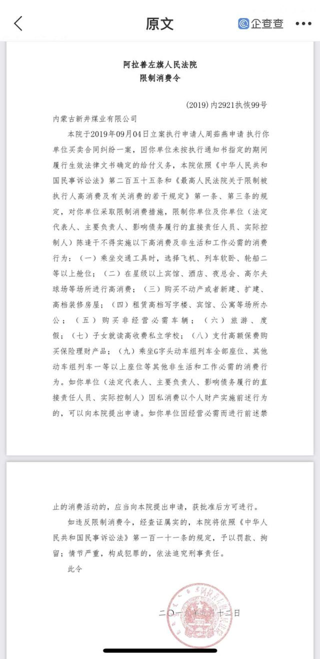 據(jù)了解,內(nèi)蒙古新井煤業(yè)有限公司于1999年登記成立,企查查平臺顯示,該公司多次涉及買賣合同糾紛、租賃合同糾紛、借款合同糾紛等,后被法院列為失信被執(zhí)行人,公司法定代表人也曾多次被法院限制高消費(fèi)。