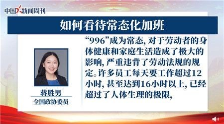 全國政協(xié)委員、編劇蔣勝男建議加強勞動法對勞動者的休息權保護,對企事業(yè)單位八小時工作制的執(zhí)行情況加強監(jiān)督管理。