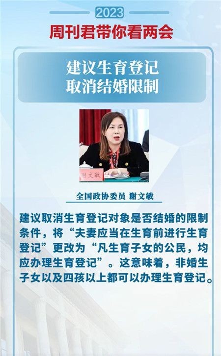 謝文敏建議,取消生育登記對象是否結婚的限制條件,將“夫妻應當在生育前進行生育登記”更改為“凡生育子女的公民,均應辦理生育登記”。這意味著,非婚生子女以及四孩以上都可以辦理生育登記。