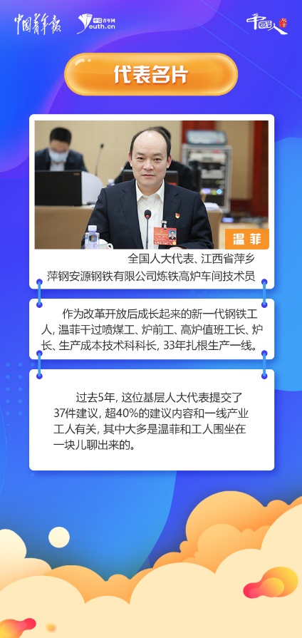 作為改革開(kāi)放后成長(zhǎng)起來(lái)的新一代鋼鐵工人,溫菲干過(guò)噴煤工、爐前工、高爐值班工長(zhǎng)、爐長(zhǎng)、生產(chǎn)成本技術(shù)科科長(zhǎng),33年扎根生產(chǎn)一線(xiàn)。過(guò)去5年,這位基層人大代表提交了37件建議,超40%的建議內(nèi)容和一線(xiàn)產(chǎn)業(yè)工人有關(guān),其中大多是溫菲和工人圍坐在一塊兒聊出來(lái)的。