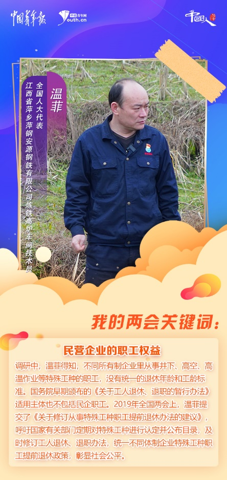 民營(yíng)企業(yè)的職工權(quán)益,一直是溫菲關(guān)注的焦點(diǎn)。調(diào)研中,溫菲得知,不同所有制企業(yè)里從事井下、高空、高溫作業(yè)等特殊工種的職工,沒(méi)有統(tǒng)一的退休年齡和工齡標(biāo)準(zhǔn)。國(guó)務(wù)院早期頒布的《關(guān)于工人退休、退職的暫行辦法》適用主體也不包括民企職工。2019年全國(guó)兩會(huì)上,溫菲提交了《關(guān)于修訂從事特殊工種職工提前退休辦法的建議》,呼吁國(guó)家有關(guān)部門(mén)定期對(duì)特殊工種進(jìn)行認(rèn)定并公布目錄,及時(shí)修訂工人退休、退職辦法,統(tǒng)一不同體制企業(yè)特殊工種職工提前退休政策,彰顯社會(huì)公平。