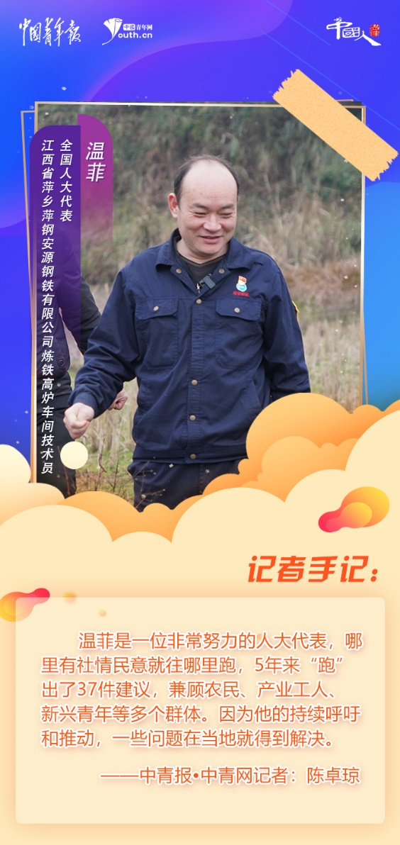 溫菲是一位非常努力的人大代表,哪里有社情民意就往哪里跑,5年來(lái)“跑”出了37件建議,兼顧農(nóng)民、產(chǎn)業(yè)工人、新興青年等多個(gè)群體。因?yàn)樗某掷m(xù)呼吁和推動(dòng),一些問(wèn)題在當(dāng)?shù)鼐偷玫浇鉀Q。