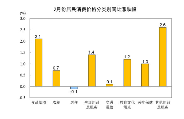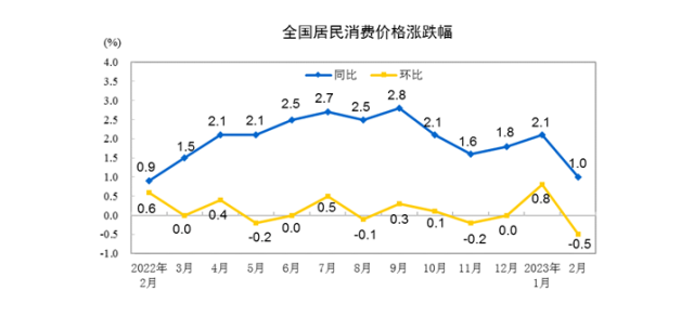 2月份居民消費價格同比上漲1.0% 環(huán)比下降0.5%