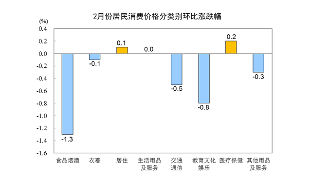 2月份,全國居民消費價格環(huán)比下降0.5%。其中,城市下降0.5%,農村下降0.5%;食品價格下降2.0%,非食品價格下降0.2%;消費品價格下降0.6%,服務價格下降0.4%。