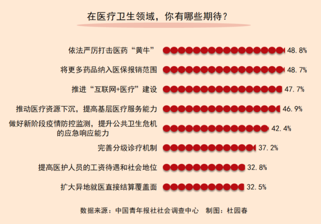 在全國(guó)兩會(huì)召開(kāi)前夕,中國(guó)青年報(bào)社社會(huì)調(diào)查中心聯(lián)合問(wèn)卷網(wǎng)(wenjuan.com),進(jìn)行了一項(xiàng)題為“兩會(huì)在即,你最關(guān)心哪些議題”的全國(guó)兩會(huì)青年期待調(diào)查,共有2201人參與。調(diào)查顯示,在醫(yī)療衛(wèi)生領(lǐng)域,48.8%的受訪(fǎng)者期待依法嚴(yán)厲打擊醫(yī)藥“黃?!?,48.7%的受訪(fǎng)者期待將更多藥品納入醫(yī)保報(bào)銷(xiāo)范圍。