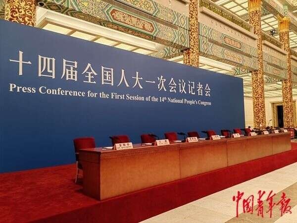 記者會現(xiàn)場沒有擺放鮮花綠植,主席臺未鋪設臺布,藍色背景板上寫著白色大字:十四屆全國人大一次會議記者會。9把紅色靠背的椅子,正在等待今天記者會的主角。