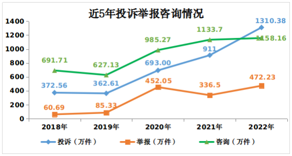 消費(fèi)者積極發(fā)揮社會(huì)監(jiān)督作用,2022年全年向市場(chǎng)監(jiān)管部門舉報(bào)各類違法線索472.23萬(wàn)件,同比增長(zhǎng)40.34%。